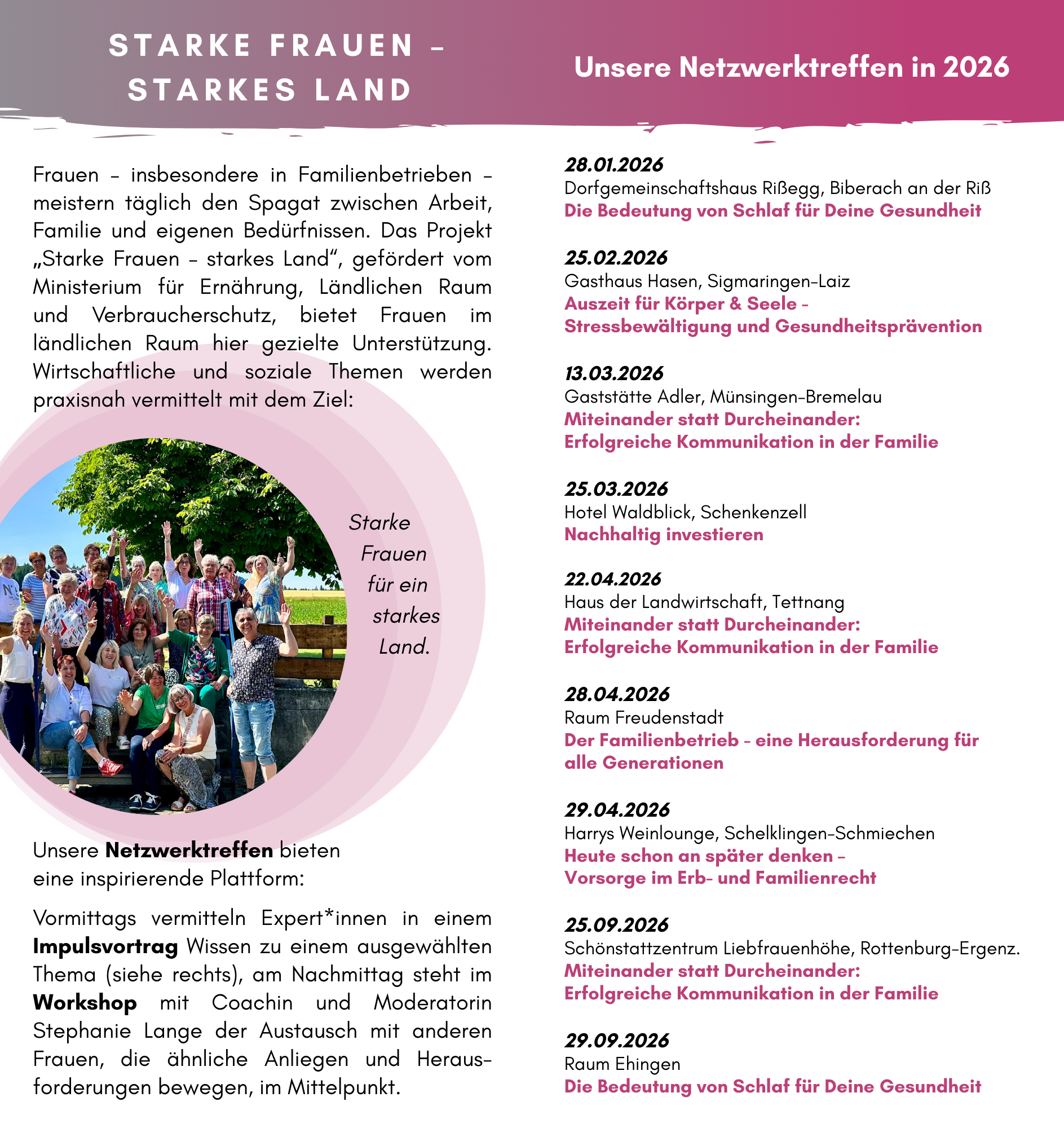 Im Projekt „Starke Frauen – starkes Land“ können Sie sich auch 2026 auf viele Netzwerktreffen in unserem Verbandsgebiet freuen. Holen Sie sich fachlichen Input, profitieren Sie von einem offenen Austausch und lassen Sie sich inspirieren!